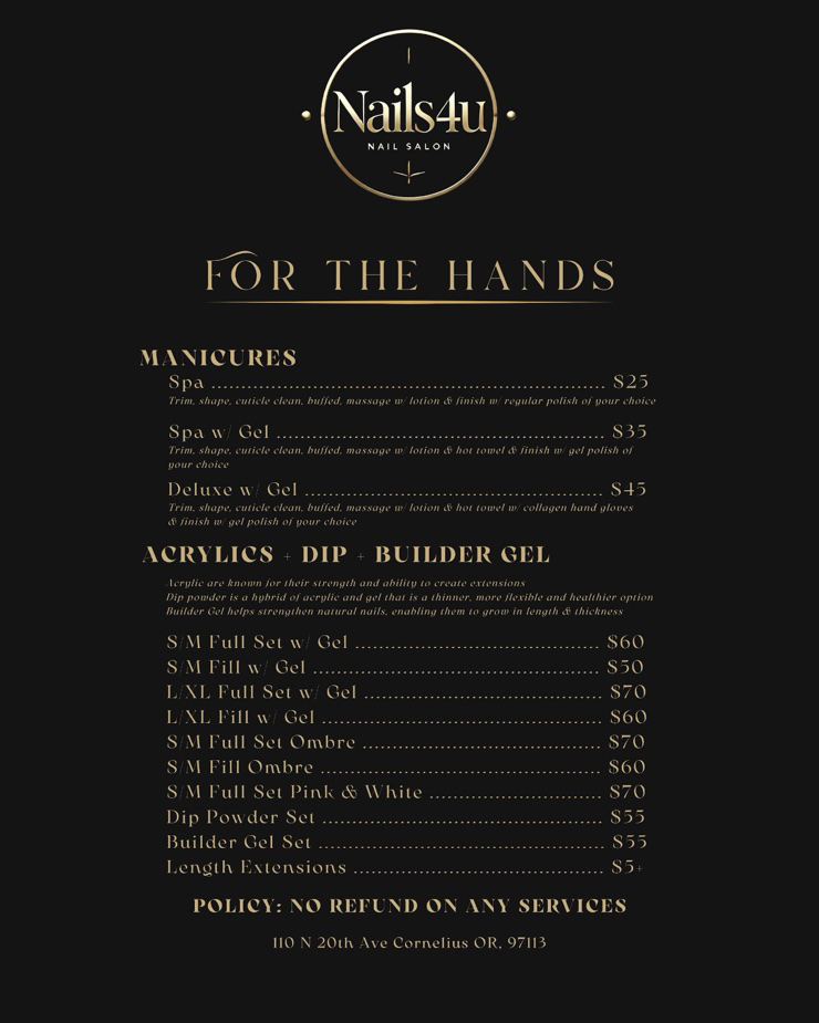 Nails 4 U - Your one-stop destination for all your nail care needs. From gel polish to nail art and extensions, we offer a wide range of services to cater to your every desire. Quality is our top priority, ensuring you leave with beautiful, long-lasting nails.